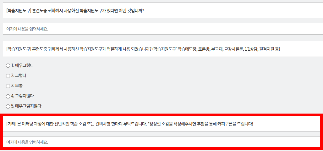 교육 수강 후 설문조사의 [기타] 항목에 정성껏 후기를 작성해주신 분들 중 일부를 선정하여 커피 쿠폰을 드립니다!