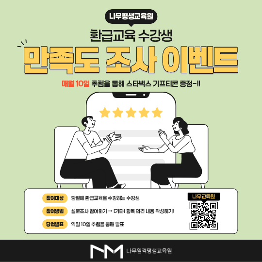 나무원격평생교육원의 더 나은 서비스를 제공하고자 만족도 조사를 실시하고 있습니다.
